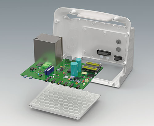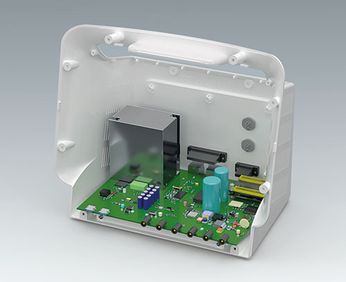- hohe Flexibilität bei der Konfiguration: Befestigungsdome für Platinen und Bauteile im Grundgehäuse, in der Bedienfront und auf der Bodenplatte